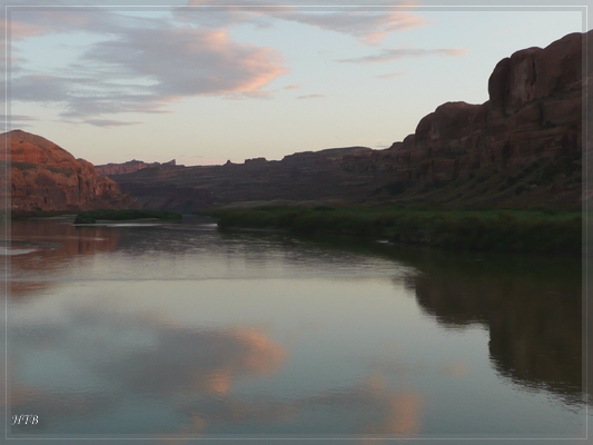 Wir queren auf unserer (oneway) 9-Meilen-Fahrt den kleinen Bach 22 Mal – plus einmal trocken über eine Brücke.  Auf der Rückfahrt logischerweise noch mal so oft. Genau mit Einbruch der Dunkelheit sind wir wieder auf der US 128. Es fängt in Strömen an zu regnen und die Fahrt bis Moab zieht sich unheimlich.
