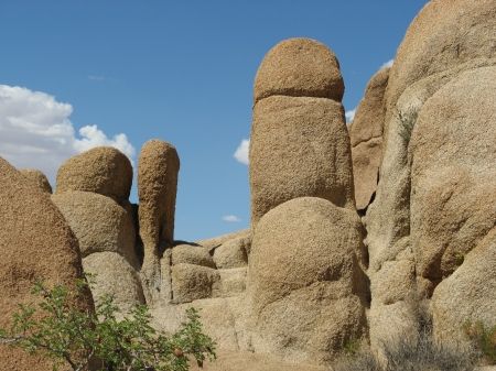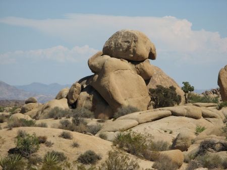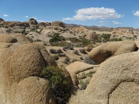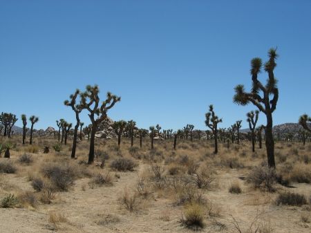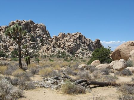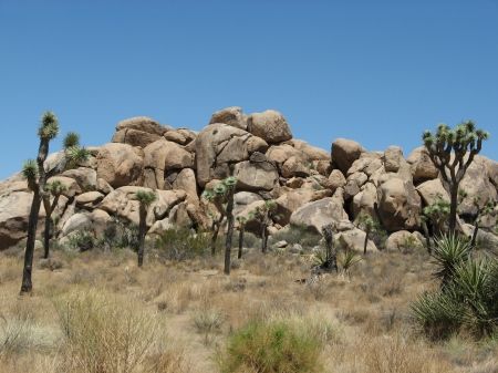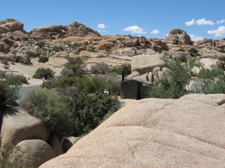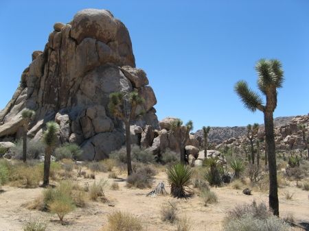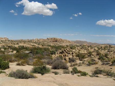 Wir besorgten noch einige Vorräte und fuhren dann gleich weiter in den Joshua Tree NP. Wir wollten - Hitze hin oder her - endlich wieder unser Zelt aufstellen. Wir nahmen den Hw. 62 bis Joshua Tree und bogen dann zum West Entrance in den Park ab. Am Eingang war niemand zu sehen, ein Schild wies darauf hin, dass bald mal jemand käme. Da wir ja einen NP Pass hatten, machten wir uns keine Gedanken und fuhren einfach weiter. Wir folgten dem Park Boulevard in Richtung Hidden Valley und erfreuten uns an dieser wunderschönen Landschaft. An verschiedenen Viewpoints hielten wir an, liefen etwas herum und machten Fotos.