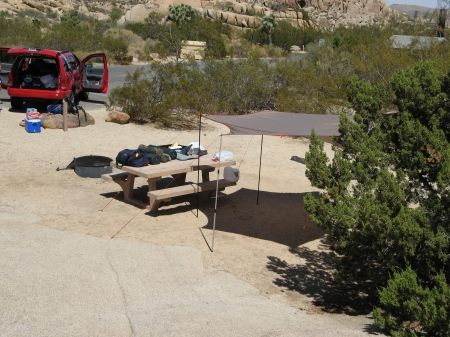 Wir spannten dann mit Hilfe von einem Baum und ein paar Stangen unser Tarp auf, um etwas Schatten zu haben. Das hat dann auch leidlich funktioniert, zumindest ein winziges Eckchen der Picknickbank war schattig.