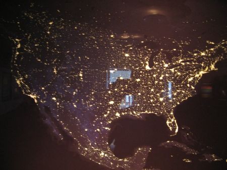 Unter anderem hing dort ein großes Satellitenfoto von Nordamerika, auf dem man den nächtlichen Lichterschein sehen konnte. Man konnte mühelos anhand der Lichtflächen die Metropolen oder dicht besiedelte Landstriche benennen. Das sah zwar auf dem Foto toll aus, fällt aber unter die Kategorie light pollution, also Umweltverschmutzung durch Licht.