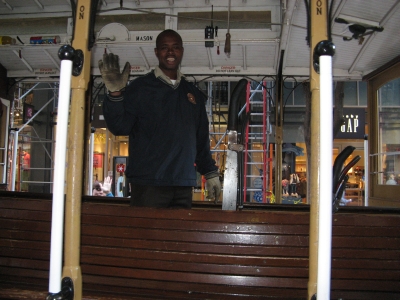 Ein Fahrgast sagte uns dann, dass wir an dem Ticketschalter Tageskarten kaufen könnten.  Ein Schild am Schalter verriet uns, dass sie keine credit cards nehmen. Also rannten wir etwas rum auf der Suche nach einem Geldautomaten. Wir fanden bald einen, rannten wieder zurück, kauften Tageskarten und stellten uns an der Schlange an. Mittlerweile war es halb 11 und wir hatten Panik, dass wir die Fähre nach Alcatraz verpassen. Bis wir in eine Cable Car in die richtige Richtung einsteigen konnten, vergingen weitere 10 Minuten. Die bummelte dann ganz langsam Richtung Cable Car Museum und hielt alle 10 m völlig unnötig an (so kam es uns jedenfalls vor).  :roll: