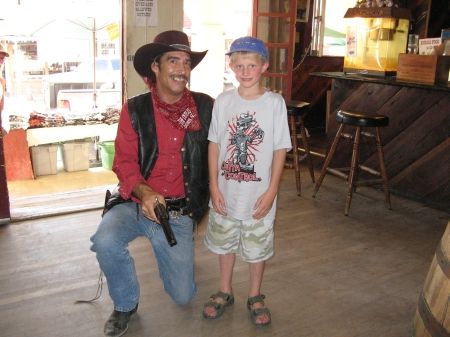 Auf einmal kam Julian angerannt und teilte uns aufgeregt mit, dass ein Revolverheld im Eingangsraum wäre. Ich griff gleich nach dem Colt ... na ja nach dem Foto ... und ging hin. Er war wohl eher Held als Bösewicht, denn er war sehr nett und ließ sich mit Julian fotografieren.