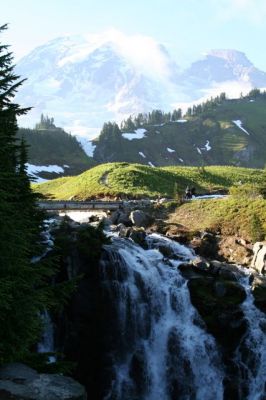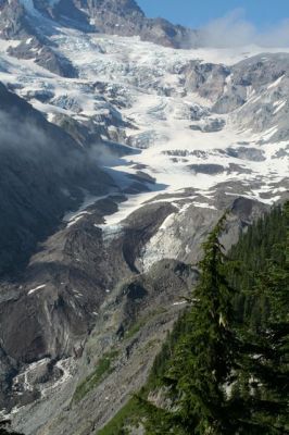 Beim Auschecken fragten wir was wir für die ganze Telefoniererei gestern schuldig wären. Der Inhaber winkte fast schon empört ob der Frage ab, meinte aber, wir könnten das Motel ja unseren Freunden in Deutschland weiterempfehlen. Hiermit getan. Danach gab es eine Kleinigkeit in der nächsten Tankstelle zu essen. Aufgrund des gestrigen Bein-Vorfalls war ich heute für größere Wanderungen natürlich nicht zu haben. Wir fuhren also nicht nochmals den Mt. Rainier hoch, sondern entschieden uns für einen kleinen Spaziergang am Fuße des Berges, nämlich den "Grove of the Patriarchs Trial". Da gibt es "Mini-Mammutbäume" zu sehen. Naja, keine Mammutbäume im eigentlichen Sinne, aber halt große Bäume. Ich weiß aber nicht mehr, um welche Baumart es sich handelte.