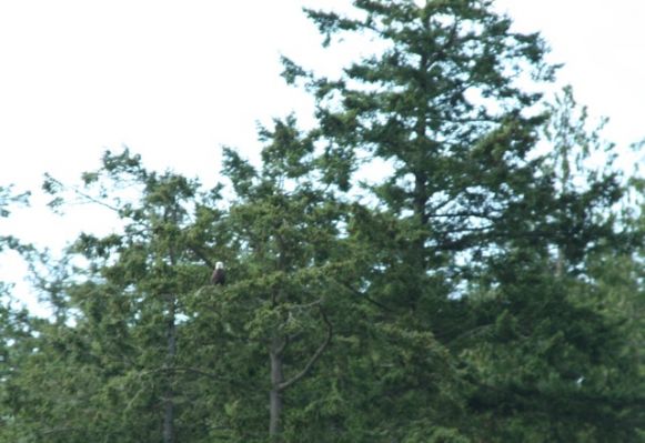 Die Reise ging am Festland entlang zu den San Juan Islands, einer Inselgruppe zwischen dem Festland und Vancouver Island. Die Landschaft dort ist nett, mit vielen Inseln, viel Wasser und vielen Bäumen und Tieren. Unter anderem konnten wir einen bald eagle erspähen, leider etwas unscharf.