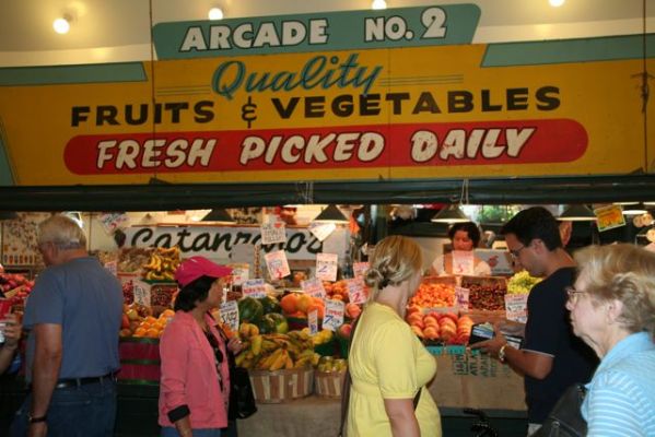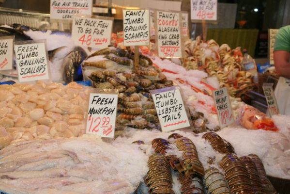 Gegen Mittag arbeiteten wir uns langsam und in aller Ruhe Richtung Norden um Pike Place Market vor. Da waren wir gestern Abend schon kurz vorbei gekommen, aber da war schon fast alles geschlossen. Der Pike Place Market ist mehrstöckig am steilen Hang gebaut. Hier gibt es alle möglichen Geschäfte, hauptsächlich für Touristenkram, aber auch viele Lebensmittel, v.a. sea food. Und natürlich viele Restaurants. Unter anderem gibt es auch eine Art Comic Book Shop, ähnlich dem "The Android's Dungeon & Baseball Card Shop", wo ich schon einen Verkäufer wie den Comic Book Guy erwartete, denn genau so sah der Laden aus. Aber das Personal bestand nicht aus dicken mittelalten Männern, sondern jungen schlanken Frauen. Dafür war bei der Kundschaft der eine oder andere dabei, der wie der Comic Book Guy aussah.