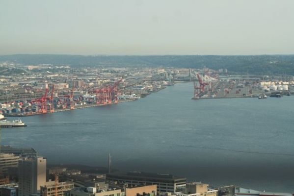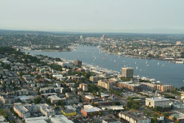 Als wir wieder raus waren, sind wir noch ein bißchen durchs Gelände geschlendert und dann rauf auf die Space Needle. Es war inzwischen zwischen 18 und 19 Uhr und die Lichtverhältnisse waren ganz nett. Oben gab es eine Art Führung bei der erklärt wurde, was man gerade sehen konnte. Unter anderem wurde auf ein Haus hingewiesen, wo die Aussenszenen für das Krankenheus in "Grey's Anatomy" gedreht wurden. Die Innenszenen die anderen Aussenszenen wurden natürlich irgendwo in L.A. gedreht. Bilder von diesem Haus hamwer nicht, dafür aber