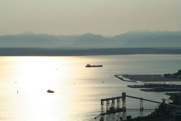 Leider sind wir Deppen nicht bis zum Sonnenuntergang geblieben. Aber wir hatten Hunger und oben auf der Space Needle wollten wir nicht essen, die nehmen's von den Lebenden. Wir sind zurück zum Pike Square und haben dort ein nettes Restaurant gefunden, wo wir einen Platz mit Blick auf die Bucht bekommen haben. Das Essen war sehr gut und die Aussicht bei Sonnenuntergang auch. Schöne Aussicht bis rüber zum Olympic National Park.