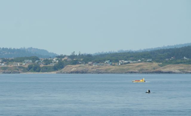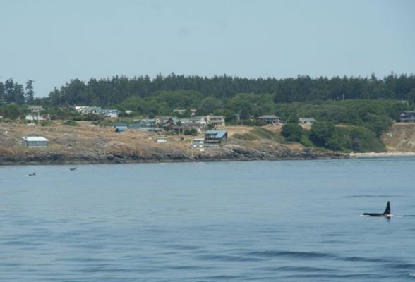 Dort gab es eine Pause mit Landgang, die wir nutzten uns das Dörfchen etwas anzusehen und eine Kleinigkeit zu Essen. Da der Aufenthalt aufgrund der "Havarie" verkürzt worden war, hatten wir nur wenig Zeit uns an Land umzusehen. Kurze Zeit später ging es dann weiter, zum Whale Watching -Teil der Reise. Dazu fuhr das Schiff ein Stück an der Küste der San Juan Island entlang. Hier in der Gegen spielt übrigens ein Teil der Buches "Der Schwarm". In diesem Buch greifen hier die Orcas die Whale Watching-Boote an und töten die Touristen. Um es vorwegzunehmen, das ist uns nicht passiert.