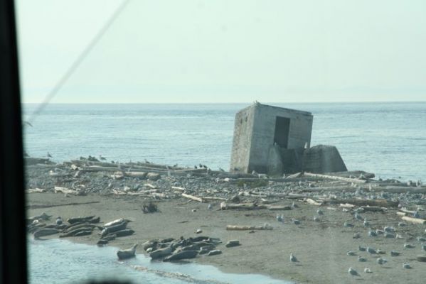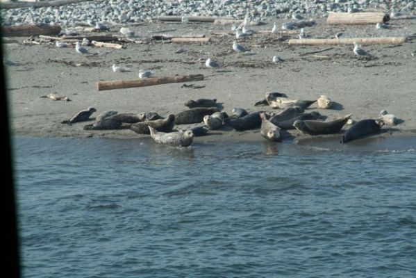 Die Stimmung an Bord war gut, die Besatzung sehr nett und bemüht und der Captain erklärte immer wieder per Lautsprecher wo wir gerade waren, was man sah und erzählte immer wieder wissenswertes über die Gegend und die Route. So fand hier in der Gegend wahrscheinlich der unblutigste Krieg der Geschichte statt, nämlich der "pig war". Das war ein Grenzkonflikt zwischen den USA und Kanada im Jahr 1859 über die Grenzziehung zwischen dem Festland und Vancouver Island. Streitig war, zu welchem Land die San Juan Inseln gehören sollten. Der Name des "Krieges" kommt von dem einzigen Opfer des Konflikt, einem (kanadischen?) Schwein. Ein amerikanischer Siedler hatte sich auf einer der Inseln breit gemacht und erschoss ein Schwein, das sich über seine Kartoffeln hergemacht hatte. Dummerweise gehörte das Schwein einem Beschäftigten der (kanadischen) Hudson Bay Company. Die kanadischen Behörden drohten daraufhin, den Amerikaner zu verhaften, woraufhin dieser die US Army zu Hilfe rief. Beide Nationen sandten Truppen und Kriegsschiffe in die Gegend. Allerdings weigerten sich die Offiziere und Soldaten beider Seiten, aufeinander zu schießen und der Konflikt wurde schließlich diplomatisch beendet, unter anderem durch Vermittlung von Kaiser Wilhelm I.