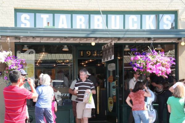 Im Pike Place Market ist natürlich tagsüber viel los. Trotzdem hat es uns gut gefallen. Wenn man oben rauskommt, führt eine Straße vorbei und an dieser Straße sind auch wieder alle möglichen Geschäfte. Unter anderem eben der allererste Starbucks-Laden. Wie gestern Abend auch stehen da immer lauter Leute rum und machen Fotos von dem Laden. Warum weiß ich auch nicht, entweder, weil's der allererste Laden ist oder wegen dem alten Starbucks-Firmen-Logo, das nun ja, etwas freizügiger aussieht als das allerseits bekannte Logo.