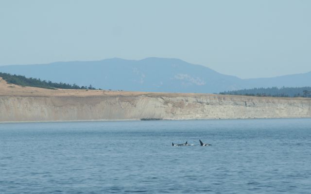 Schon kurz darauf sahen wir eine Gruppe Orcas. Einer aus der Besatzung machte uns per Lautsprecher auf Sichtungen aufmerksam und erklärte einiges zu den Walen. Hier in der Gegend gibt es ca. 85 Orcas, die hier sozusagen sesshaft sind, sogenannte residents. Oft kommen auch eher nomadisch lebende Orcas vorbei, sogenannte transients. Hier in der Gegend kommen immer wieder auch andere Walarten vorbei, aber nicht zu dieser Jahreszeit.