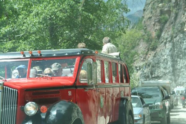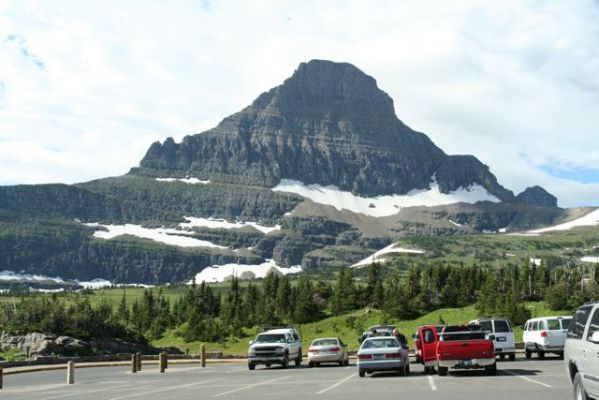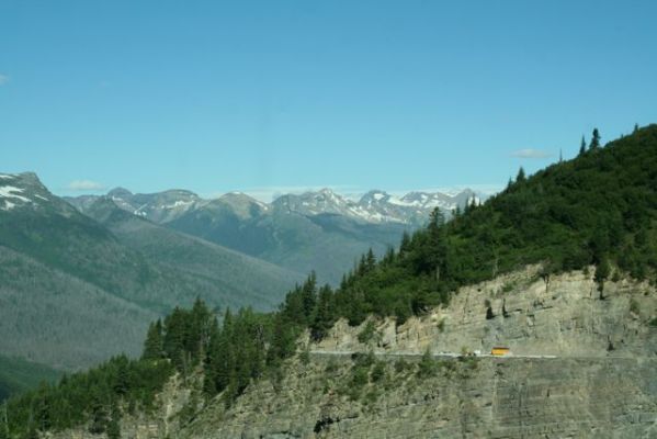 Da wir gestern den Park nur "angekratzt" hatten, wollten wir heute die gesamte "Going-to-the-Sun-Road" entlangfahren. Das ist die einzige Straße durch den Park. Da diese ca. 50 Meilen lange Straße über sehr hohe Lagen führt, ist sie die meiste Zeit des Jahres verschneit und meistens nur von Mitte Uni bis Mitte September befahrbar. Die Straße ist stellenweise sehr eng und kurvig, daher dürfen Fahrzeuge länger als 21 feet sie nicht befahren. Dafür gibt es rote Shuttelbusse, die sogenannten "Jammer", die man kostenlos benutzen darf. Das hat natürlich den Vorteil, dass man sich nicht aufs Steuer konzentrieren muss und stattdessen die Landschaft besser ansehen kann. Wir wollten aber flexibel sein und sind deshalb mit unserem Auto gefahren. Ihren Namen hat die Going-to-the-Sun-Road übrigens vom Going-to-the-Sun-Mountain, der vermutlich nach einer indianischen Legende benannt ist.