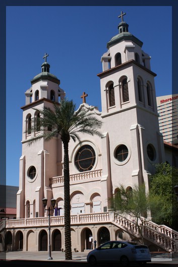 Kolibri im Desert Botanical GardenNach mehreren Stunden im Park brechen wir wieder auf und fahren nun zur Downtown von Phoenix. Wir parken bei der St. Mary's Basilica und schlendern ein wenig herum. Irgendwie kommt uns die Stadt ein wenig halbherzig vor: Hochhäuser gibt es kaum und die wenigen sind nicht sonderlich hoch oder sonstwie architektonisch herausstechend; historische Gebäude lassen sich an einer Hand abzählen. Dennoch gefällt es uns hier recht gut, vor allem wegen der überall herumstehenden Skulpturen.
