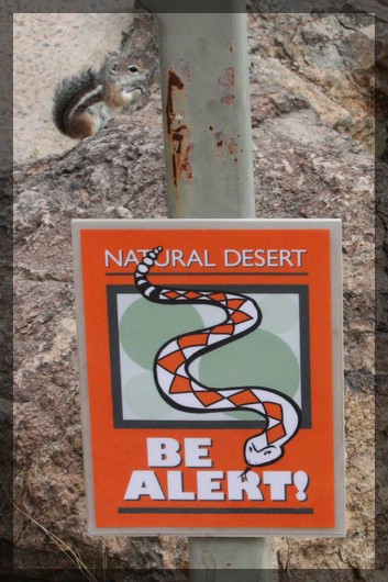 Ein auf einem Saguaro sitzendes NilpferdIm Desert Botanical Garden in Tucson wird der Besucher am Eingang des Wüstenareals eindringlich vor den dort lauernden Gefahren gewarnt. Dass sich nicht nur menschliche Besucher diese Warnung sehr zu Herzen nehmen, sieht man am skeptischen Blick des kleinen Gesellen im Hintergrund.