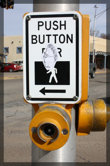 Werden da nur Leute mit einem BMI unter 25 und guten Laktatwerten reingelassen?In der am 11.5. geposteten Etappe wurde beschrieben, dass wir in Taos einige Zeit an einer ganz offensichtlich nicht richtig funktionierenden Fußgängerampel warten mussten. Das Problem hatten scheinbar schon andere Leute vor uns. Diese haben sich dann die Zeit mit kreativen Verschönerungen der Ampel vertrieben.