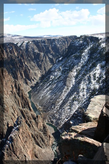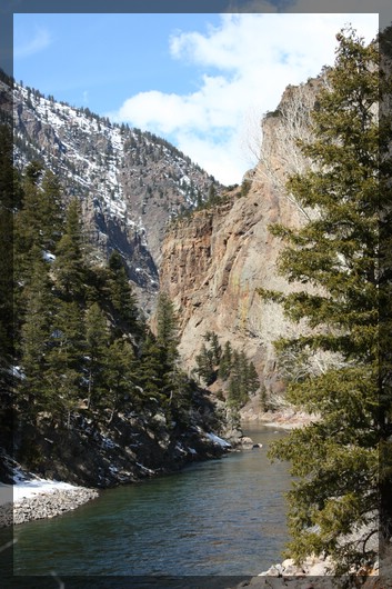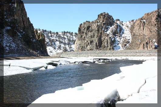 Auf der anderen Passseite fahren wir wieder hinunter in das sich weitende Tal nach Gunnison. In diesem netten Städtchen gehen wir ein wenig spazieren und betrachten die Häuser im Westernstil. Dann fahren wir weiter zur Curecanti Recreation Area. Gleich an deren Beginn halten wir an einem kleinen Rastplatz und laufen hinunter zum Gunnison River, der hier noch nicht aufgestaut ist. Malerisch schlängelt sich der Fluss zwischen schwarzen Felsen hindurch. Wäre er nicht mit dicken Eisschollen bedeckt, man käme sich vor, wie in der Kulisse eines Westernfilms.
