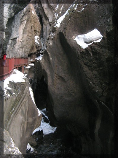 Dann wird der Weg schwieriger: Im Sommer wohl kein Problem, gestaltet sich der Weg zu dieser Jahreszeit als abenteuerliche Rutschpartie über festgetrampelten Schnee. Wir atmen auf, als wir das Stahlgerüst erreicht haben, das in den Canyon hinein führt. Der Canyon selber ist sehr eindrucksvoll. Ein wenig erinnert er uns an die Partnachklamm bei Garmisch-Partenkirchen.