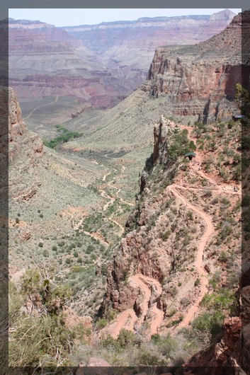 Man muss den Fluss übrigens gar nicht überqueren, da es auch eine Verbindung auf der Südseite das Colorado River gibt. Auf dieser kommt man zwar nicht ganz zum Fluss runter und auch nicht in die schöne grüne Gegend am Bright Angel Creek. Aber als allerletzte Notlösung kann man diesen Weg im Hinterkopf behalten.