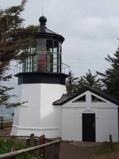 Südlich von Bandon führt die 101 etwas von der Küste weg, hier werden die Wolken dünner und die Sonne kommt auch mal durch. Beim Abstecher nach Cape Blanco werden wir jedoch im Nu wieder von Nebelschwaden eingehüllt, die der kräftige Wind über das Kap bläst. Vom Parkplatz aus können wir nur vermuten, daß am Ende des Weges ein Leuchtturm steht - wir sehen ihn erst, als wir einige Meter davorstehen.