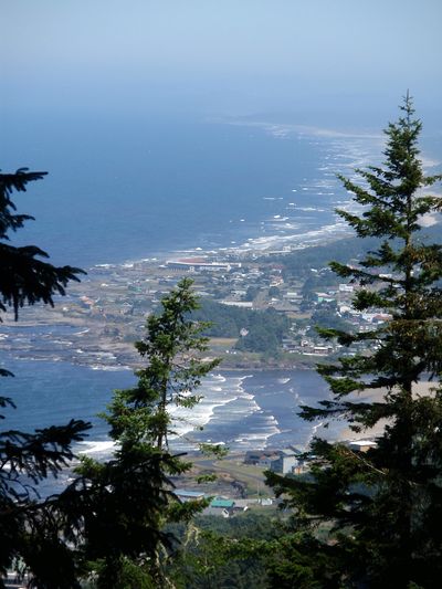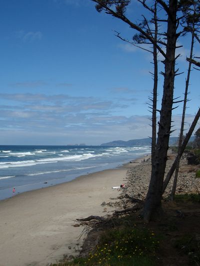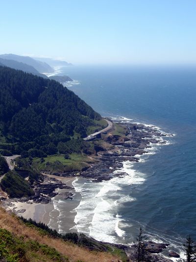 Entlang der Tillamook Bay führt die Straße teilweise am Ufer entlang, teilweise durch Weiden (viele Kühe gibts hier), zum Cape Meares State Park gehts dann aber wieder die Hügel rauf. Auch hier wieder alles sehr grün, viel Wald. Von oben hat man einen schönen Blick auf die Steilküste: