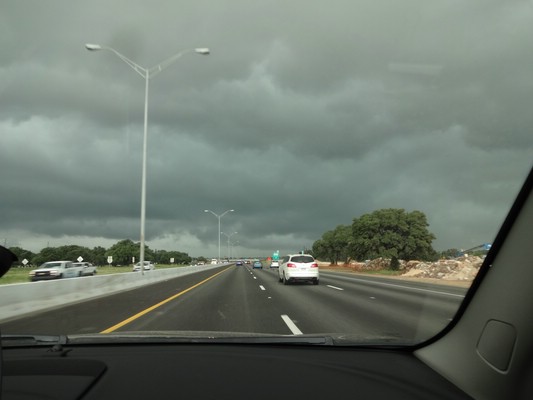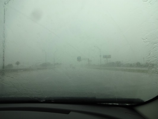 und es begann sehr stark zu regnen. Man konnte die Fahrbahn kaum noch erkennen. Es gab innerhalb von einigen Minuten einen Temperaturabfall von 88° auf 68° Fahrenheit. Das war richtig unheimlich.