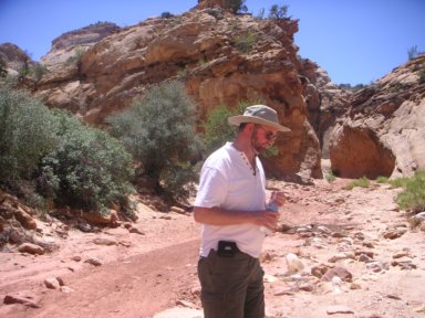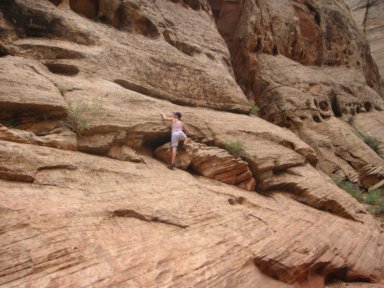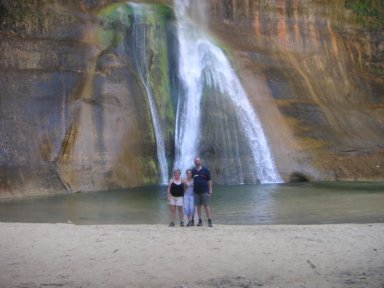 Am nächsten Morgen gings in den Capitol Reef Natinoal Park. Also Morgen kann man es nicht mehr nennen! Wir kamen mal wieder spät los. Also so gegen Mittag fuhren wir dann endlich in den Park. Dort angekommen gingen wir erst mal ins Visitor Center. Danach fuhren wir zu einer Wanderung, die wir dann auch machten. Sie führte durch den Capitol Gorge zu den Tanks. Normale Menschen wären die normale Wanderung gegangen, aber mein Vater meinte die Wanderung würde ja noch weiter gehen und wir stapften ungefähr ne halbe Stunde über irgendwelche Steine die irgendwie alle gleich aussahen! Aber mein Vater war zufrieden und das war auch gut so. Als wir dann zurückgingen wanderten wir den eigentlichen Weg zu den Tanks. Dort sah man aber nur einen Tank mit Wasser gefüllt. Also kletterte ich auf die andere Seite und sah noch ein paar. Mein Vater verschoss fast den ganzen Film unserer Fotokamera und wir gingen endlich den richtigen Weg wieder zurück zum Auto. Mal wieder total fertig schmissen meine Mutter und ich uns auf die Sitze. Mein Vater baute uns wieder auf indem er sagte: „Jetzt reißt euch mal zusammen! Die größte Wanderung machen wir doch jetzt erst!“ Wir stöhnten auf. Typisch mein Vater! Immer einen aufmunternden Satz auf Lager! Naja aber mit uns kann mans ja machen. Wir fuhren aber erst zu einem Wasserfall, dem Freemont River Waterfall. Das war sehr schön dort! Ich kletterte irgendwo im Wasserfall rum, mein Vater machte wieder seinen bekannten schwenk mit der Videokamera und meine Mutter schimpfte rum ich sollte sofort runterkommen das wäre doch viel zu gefährlich. Also wieder mal eine ganz normale Besichtigung der Natur. Danach gingen wir wieder zum Auto zurück und fuhren zu unserer „großen“ Wanderung. Wir gingen durch den Grand Wash Trail zu den Narrows. Das erste Stück war total öde, aber danach wurds dann wenigstens etwas spannender. Es war nur mal wieder heiß! Warum müssen gerade unsere Wanderungen denn auch immer total in der Sonne sein