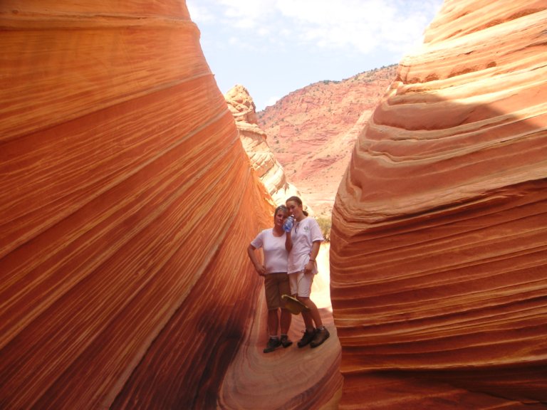 Wach endlich auf!“, rief mein Vater. „Vergiss es! Ich schlafe“, fauchte ich und dreht mich so abrupt um dass ich meinen Vater wieder in sein Bett beförderte. War mir auch sehr recht so. Es war grad mal halb sieben!! Schrecklich diese Zeit…in Deutschland heißt das für mich: halb schlafend frühstücken, mit Augen zu Zähne putzen, anziehen, meinem Hasen völlig verschlafen guten Morgen sagen und dann mit meinem Rad zur Schule fahren. Also gar keine guten Erinnerungen!! Aber es half alles nichts. Meine Mutter war mal wieder am keifen, dass ich doch aufstehen sollte und mein Vater packte schon mal die Rucksäcke mit Wasser für die wave. Schließlich stand ich doch noch auf und zog mir meine Wandersachen an. In meine Wanderschuhe traute ich mich wegen meines Zehs noch nicht. Mit zwei Gallonen Wasser und sechs oder sieben verschieden großen Wasserflaschen gings los. Im Auto schlief ich fast wieder ein! Wir hatten etwas weniger als eine Stunde zu fahren. Zwischendurch hielten wir noch bei der Paria Rangerstation um nach dem Wetter zu fahren. Der Ranger meinte es würde mal wieder sehr heiß werden. Wir kamen an der off Road die zur Wave führte an. Meine Mutter guckte etwas gequält. Aber immerhin verstummte sie erst mal
