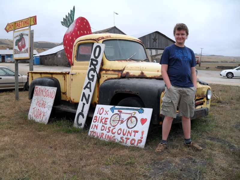 Mein Sohn Christian an der Einfahrt zur Swanton Berry Farm.
