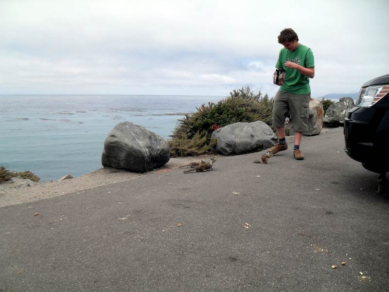Mein Sohn fand es so schön, daß er es auch einmal versuchen wollte (obwohl er eigentlich ein Angsthase ist und noch nicht mal ein Pferd oder Esel füttert). das Squirrel kam zu ihm, stellte sich auf die Hinterbeine und machte bettelnde Bewegungen.