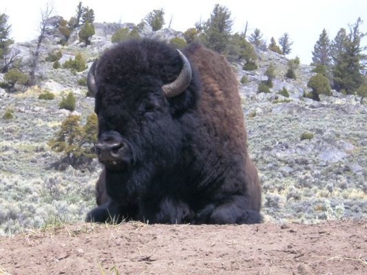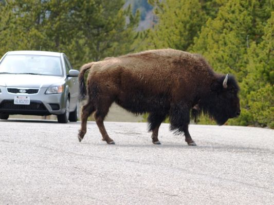 Oh mann, ich dachte: was soll da noch Besseres kommen? Nicht mal 2 Stunden in dem riesigen Park und schon sehen wir Bisons, Elche und Hirsche. O.k., die obligatorischen Fotos gemacht und weitergefahren. Und immer wieder Büffel. Einer davon lag besonders schön am Straßenrand: