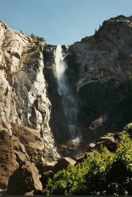 Aber ich schweife ab... Der Parkplatz am Wasserfall ist schon total belegt und langsam weiß ich, was in manchen Reiseberichten oder verschiedentlich als Hinweis zu lesen war, wenn vom "total überfüllten Yosemite N.P." die Rede war. Na ja, ein Stück weiter kann man an der Straße parken. Wir laufen die paar Meter Richtung Bridalvail Fall und man hört das Wasserrauschen bereits von weitem.
