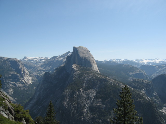 Ein Stück weiter trohnt Half Dome und in der Ferne sehen wir die Yosemite Falls neben denen wir gestern noch gestanden haben. Die Sonne lacht von einem wolkenlosen blauen Himmel. Wahrlich majestätisch dieser Anblick.