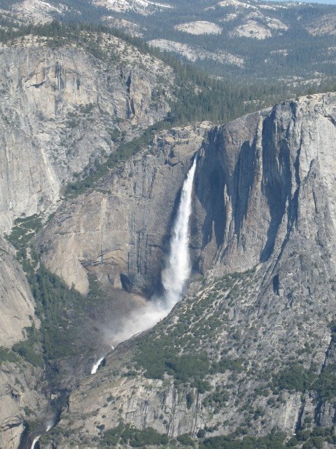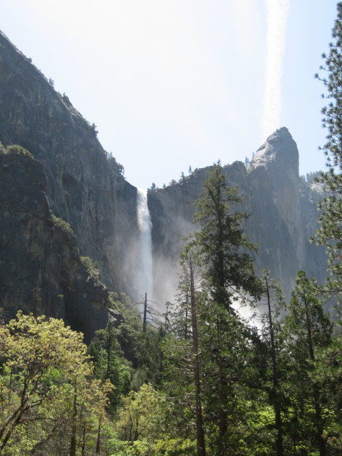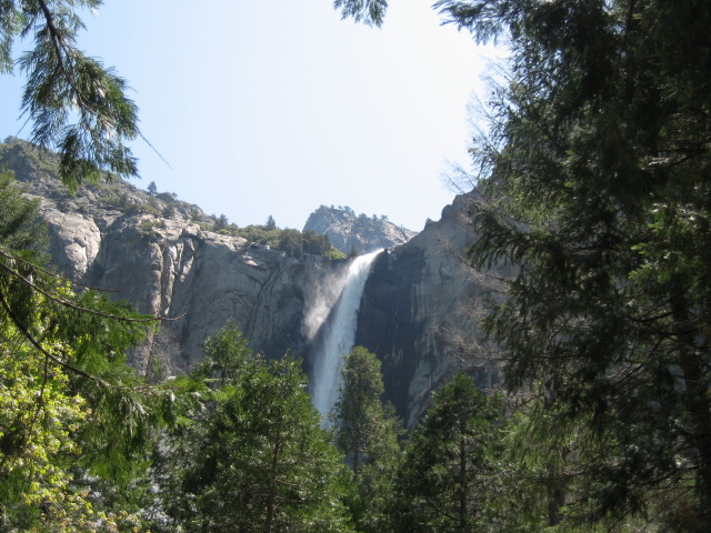 Auch hier merkt man - sogar noch viel deutlicher als gestern bei den Yosemite Falls - die Gischt. Durch die Bäume kann man sie auch schon sehen.