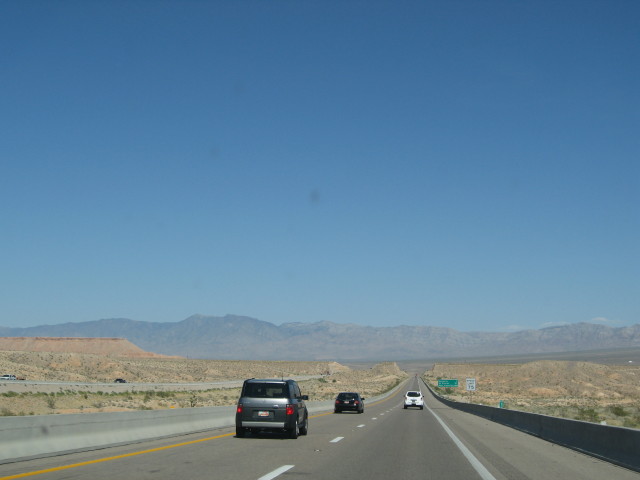 Ein kurzer Stopp bei den Indianern des Travel Shop nahe Valley of Fire, um günstig Kippen zu kaufen und den Luxy mit Sprit zu versorgen. Weiter auf die I15 und ich fühle mich irgendwie an den Streifen "Auf dem Highway ist die Hölle los" erinnert. Diese kerzengeraden Strecken sind für mich total typisch USA (obwohl es sowas sicher noch öfter auf der Welt gibt).