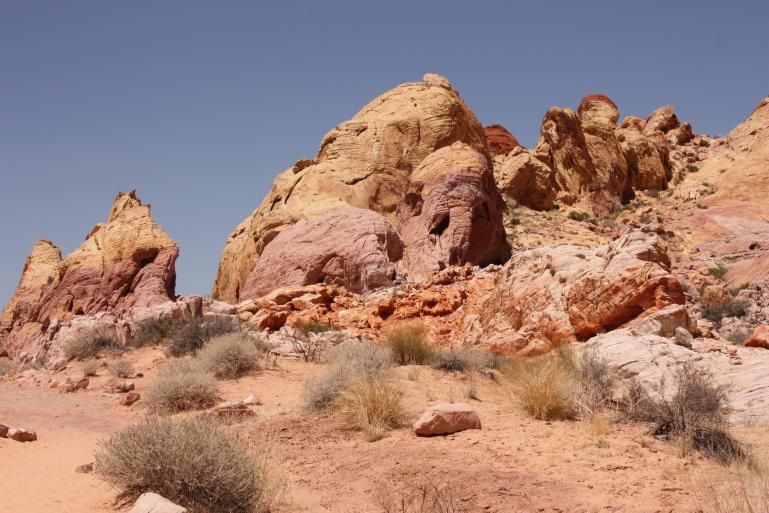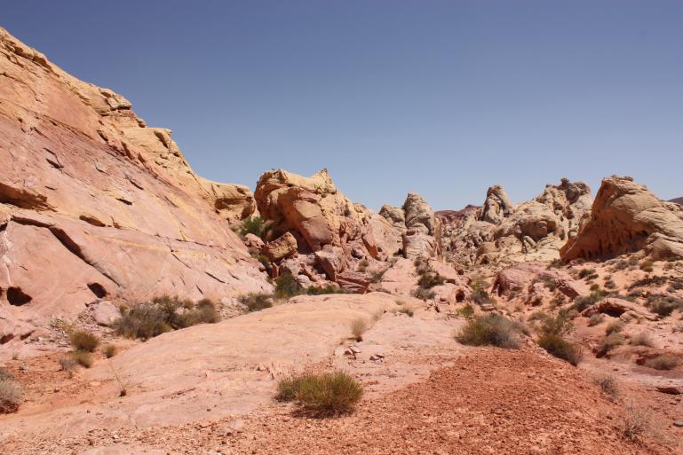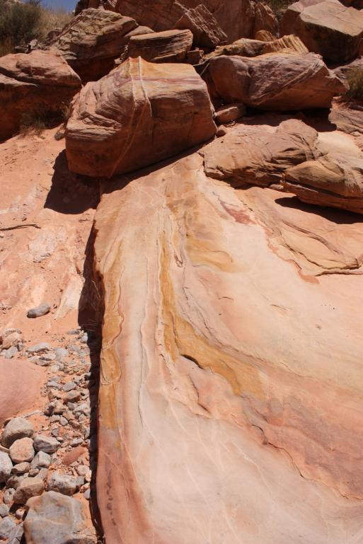 Nachdem der erste Teil des Rundweges nahezug bergab ging, geht es hinter dem Slot dann nun etwas bergauf in Richtung eines tollen Felsmassivs. Die Farben sind unbeschreiblich und auf den Bildern nur zu erahnen, von weiss über gelb bis hin zu rot und sogar lila
