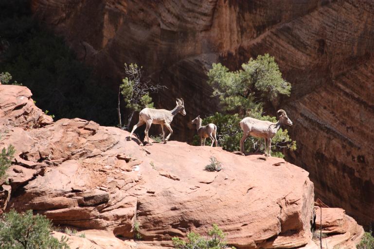 Kurz vor dem Tunnel haben wir glücklicherweise einen der wenigen Parkplätze zum Canyon Overlook Trail bekommen und dort beim Eincremen und Schuhe schnüren auf einem Felsvorsprung ein paar Bergziegen