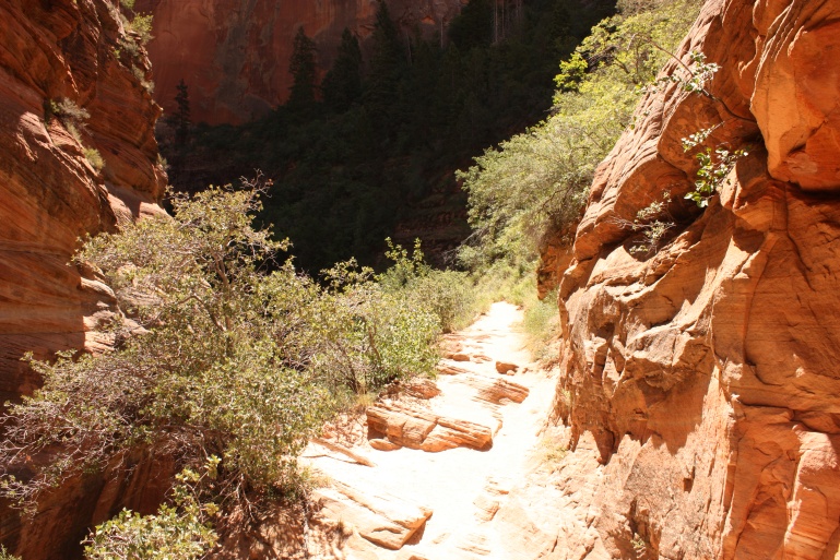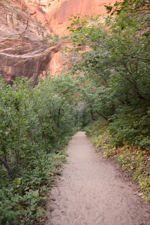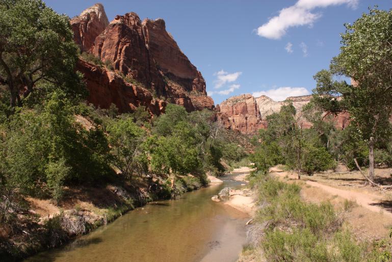 Der Trail beginnt an der Zion Lodge. Von dort geht man über eine Brücke über den Virgin River, dieser war bei unserem Aufenthalt sehr friedlich. Er ist jedoch auch für die ein oder andere Überschwemmung bekannt, schnell kann er um ein vielfaches anschwellen.