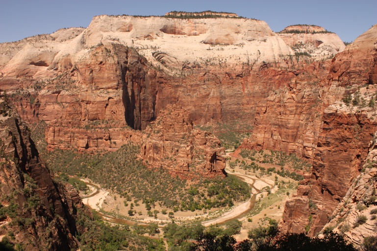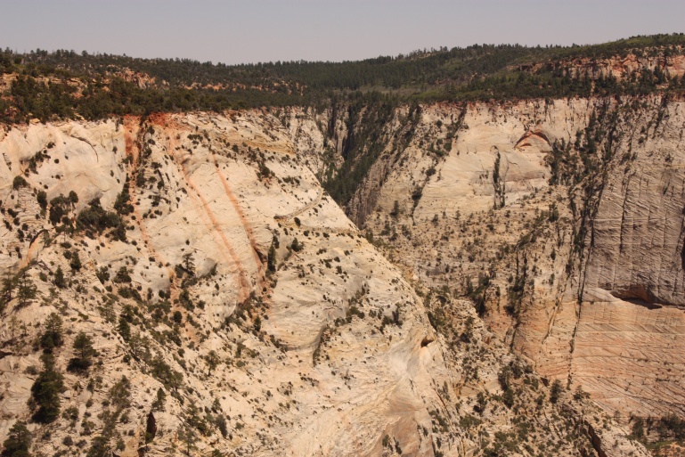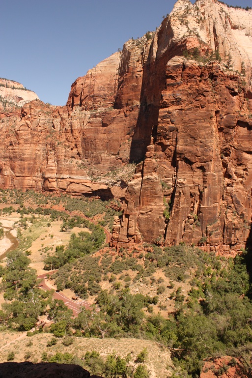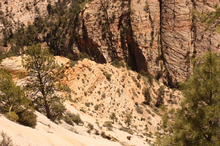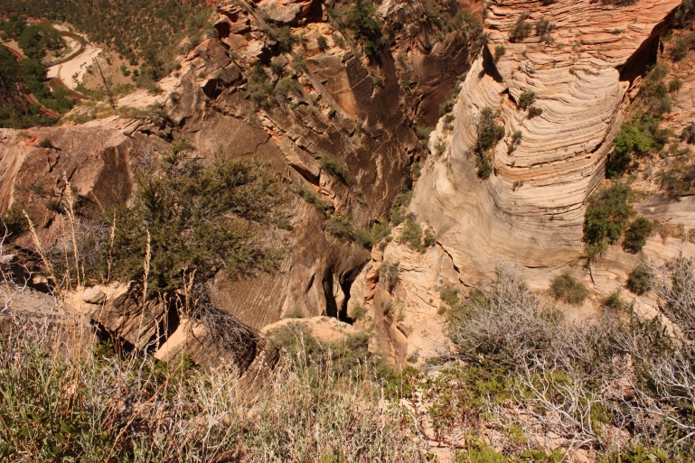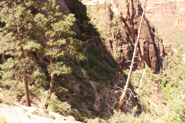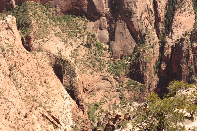 Am Ziel schauen wir uns erstmal voller Staunen den Weg an, den wir hochgekommen sind, hier der erste Teil, die Switchbacks die auf sich auf halben Weg dann aufteilen (rechts Hidden Canyon - links Echo Canoyn und Oberservation Point bzw. der East Rim Trail)