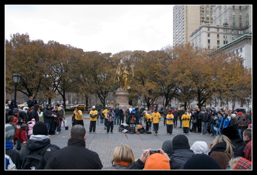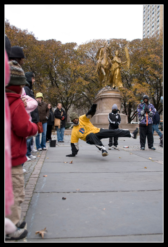 Am Südende des Parks treffen wir auf eine Menschenansammlung, und eine Breakdance-Truppe, die bei diesen eisigen Temperaturen die Massen versuchen zu begeistern. Wir bleiben 10 Minuten, um ein paar Fotos zu machen, und machen uns auf den weiteren Weg.