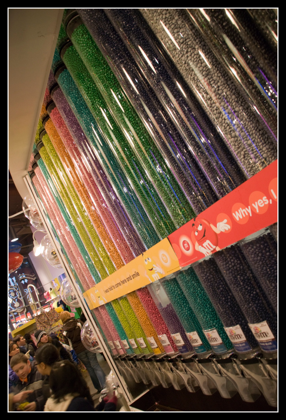 Nach dem oppulenten Mahl auf dem Planeten des Stechpalmenwaldes ist es natürlich schon dunkel, und ich dränge meine Familie Richtung Rockefeller Center, da ich ja noch auf Nachtaufnahmen scharf bin. Da wir nirgends ohne spontane Abstecher hinkommen, klappt es auch dieses Mal nicht, und wir landen im M&M Store. Hier kann man alles mögliche und unmögliche mit den kleinen Nuß-Schoko-Pillen kaufen. Die riesige Wand mit M&M's in Röhren zum selber abfüllen finde ich als echter Schokoladenfreund wahnsinn.