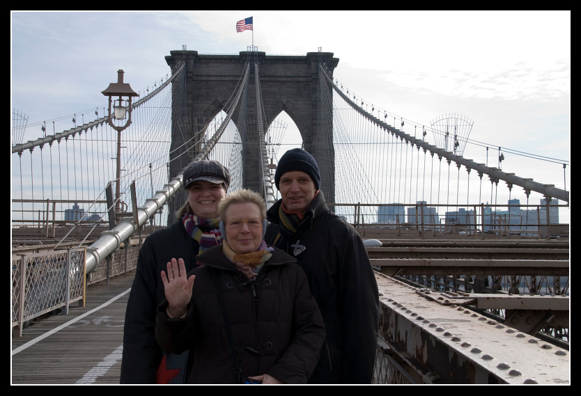 Von innen und außen gewärmt, und von italienischen Touristen genervt, gehen wir auf die Bridge. Es ist doch immer wieder einer der schönsten Momente einer New York Reise. Die unverwechselbaren Bögen der Brückenpfeiler, die einen New York Liebhaber innerhalb von Sekundenbruchteilen verraten welches Bild er vor sich hat. Diese imposante Skyline, die man vom anderen Ende aus erblickt. Und dieses Leben, was auf dieser wichtigen Verkehrsader New Yorks pulsiert und brummt. Einfach fantastisch finden nicht nur meine Frau und ich. Meine Schwiegermutter ist total ruhig und ergriffen. Langsam realisiert sie, dass sie tatsächlich in New York und auf einem seiner Wahrzeichen steht. Wir lassen uns für den Weg rüber und zurück also auch entsprechend Zeit.