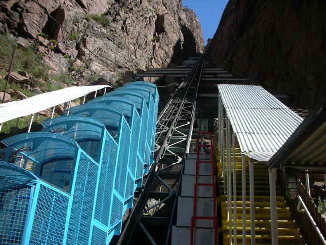 Mit dem Entertainment Book bekommen wir für 2 Personen freien Eintritt, zum Schluß noch was Geld sparen  . Trotz des schönen Wetters ist heute kaum etwas los, nur wenig Betrieb an der Brücke. So brauchen wir an der Station der Incline Railway auch nicht zu warten und können direkt in die erste Kabine einsteigen. Mit der Incline Railway geht es 473 Meter abwärts in die Schlucht unterhalb der Brücke.