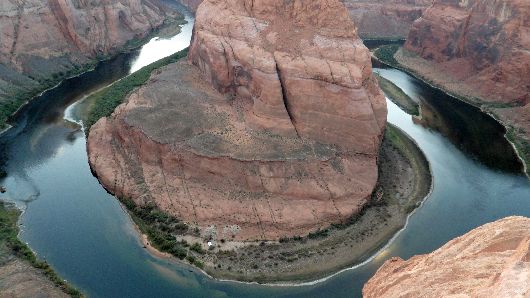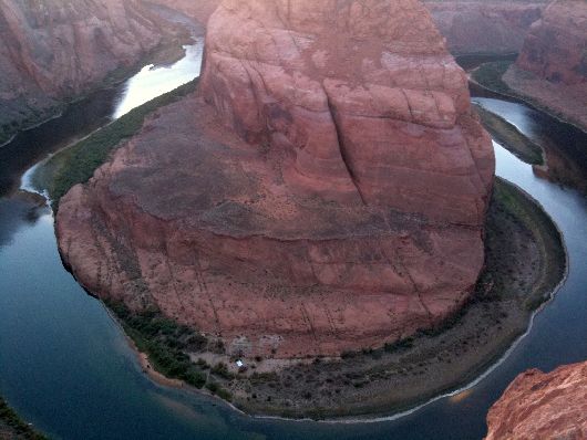 Dann setzen wir uns hin und genießen einfach unsere atemberaubende Umgebung. Kurz bevor der letzte Sonnenstrahl hinter dem Berg verschwindet kommt plötzlich Leben in die wartenden Menschen. Es sind nämlich doch noch einige dort. Jeder positioniert sich eifrig irgendwo hin, um die besten Fotos zu bekommen. Und auch wir machen dann, als die Sonne weg ist, doch noch ein paar ganz ordentliche Bilder. Auch wenn man sicher schon bessere vom Horseshoe Bend hier gesehen hat.