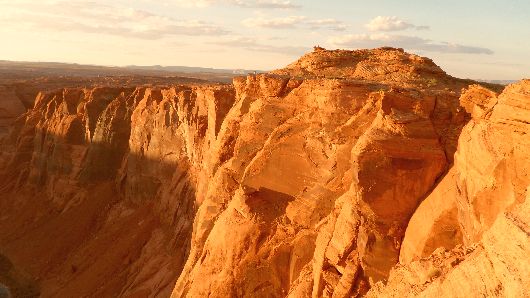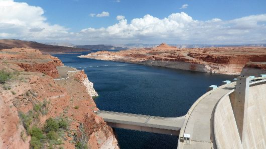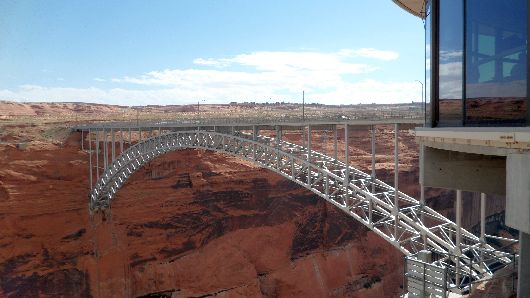Wir mögen uns gar nicht so recht trennen, aber wir müssen ja noch etwas fahren, also geht es dann irgendwann los Richtung Page. Die Landschaft ist total karg und von der Hitze gezeichnet. Meilenweit ist keine wirkliche Zivilisation zu erkennen. Nur ab und an ein paar Navajo-Wohnwagen. Unser Navi zeigt uns an, dass Page nur noch wenige Km entfernt ist, und wir sind doch etwas ratlos irgendwie, denn man kann ja ewig weit geradeaus in die Ferne schauen, und ein nahender Ort ist da beim besten Willen nicht zu erkennen. Irgendwann macht die Straße aber eine Biegung, man fährt eine Anhöhe hinauf und tatsächlich, dahinter erscheinen die ersten Häuser und Motels von Page.