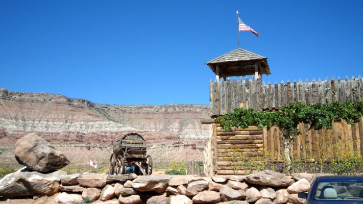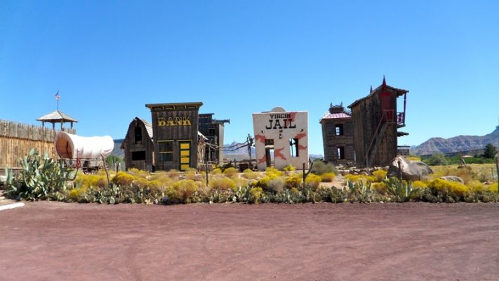 Wir fahren weiter Richtung St. George und einige Meilen, nachdem wir aus Springdale raus sind, entdecken wir plötzlich einen total urigen Rasthof am Straßenrand.  Sofort ist klar, da halten wir mal an. Das Fort sind von aussen gar nicht so groß aus, aber als wir eintreten werden wir schier erschlagen von dem Ausmaß. Wir befinden uns in einem riiiieeesigen Gift-Shop, den man mitten im nichts gar nicht erwartet. Jeglicher Schnick-Schnack den man sich denken kann, und im hinteren Teil noch Westernzubehör und dergleichen. Auch etwas zu Essen kann man bekommen und „homemade icecream“. Wir beschließen uns mal ein Eis zu gönnen und draußen im Schatten zu genießen. Wir entscheiden uns beide für die Sorte „Virgin Vanilla“ und ich muss ein bisschen lachen, die ist im Gegensatz zu den anderen Eimern nämlich wirklich noch jungfräulich. Wir sind die ersten, die daraus bestellen.  :)  Wir setzen uns also raus und genießen unser Eis. Und ich bin schwer überrascht wie unglaublich lecker es ist. Ich hätte niemals erwartet, das man in den USA so tolles Eis macht.  :groove: