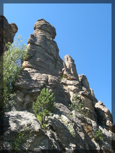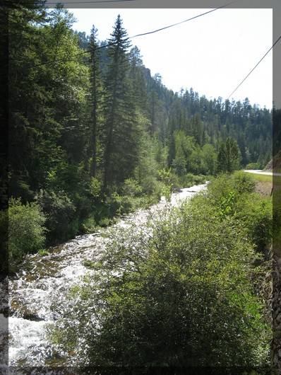 Im Spearfish CanyonDa wir gern etwas von dieser Stadt sehen wollen, verlassen wir die Interstate eine Ausfahrt vor der, die unser Navisystem empfiehlt - und geraten gleich in eine Baustelle. Der Umweg durch die Stadt hat sich auch so nicht wirklich gelohnt…