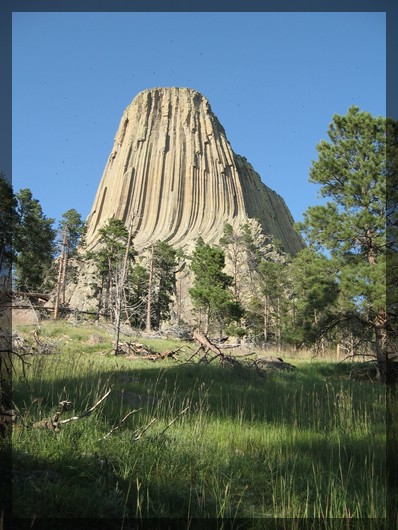 In Wirklichkeit ist der Devils Tower der erstarrte Lavaschlot eines Vulkans, der selber inzwischen wegerodiert ist.