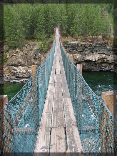 Hinter Libby folgt die Straße dem Kootenai River. Zwischen Straße und Fluss verläuft eine Eisenbahnlinie. Von einem Parkplatz führt ein kurzer Trail zu den Kootenai Falls. Dieser Trail geht zunächst durch einen Zedernwald, überquert dann auf einer schmalen Stahlbrücke die Eisenbahn und läuft dann durch Ufergestrüpp aus Heckenrosen und Knallerbsen am Fluss entlang zu den Fällen. Diese sind nicht besonders hoch, eigentlich nicht viel mehr als Stromschnellen, aber durch die Breite des Flusses  dennoch recht beeindruckend.
