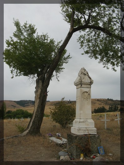 Um halb neun sind wir startfertig, fahren wieder auf die andere Flussseite und dort weiter nach Norden. Hier liegt das Colville Indianerreservat. Wir halten am Friedhof von Nespelem um das Grab von Chief Joseph zu besuchen. Dieser Häuptling der Nez Percé ist wegen seiner strategischen Begabung auch als Napoleon der Indianer bekannt. Er versuchte sein Leben lang durch Kämpfe, aber vor allem durch Verhandlungen, seinen Stamm in dessen Heimat zurückzubringen. Schließlich starb er fern dieser Heimat, nach Auskunft des untersuchenden Arztes, an gebrochenem Herzen. Sein Grab ist mit einer weißen Stele gekennzeichnet. Insgesamt fällt die Farbigkeit des Friedhofs auf, die Gräber liegen voller Gaben für die Toten: Stoffblumen, Tierfiguren und sehr häufig auch Zigaretten.