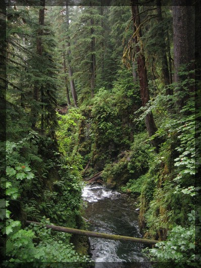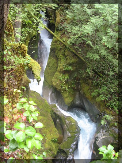 Nach dem Vortrag fahren wir ausgerüstet mit einem Parkplan zurück zum Ortseingang von Newhalem wo am Turbinenhaus des Gorge Dam der Ladder Creek Falls Trail startet. Mittlerweile hat es leicht zu regnen begonnen, aber das kann uns nicht mehr schrecken. Auf einer Fußgängerbrücke, deren Konstruktion sehr an die Swinging Bridge von gestern erinnert, gelangen wir ans andere Flussufer. Hier führt der Pfad abenteuerlich zwischen Farnen und moosbedeckten Bäumen über kleine Holzbrücken und -treppen bis zu einer Klamm, in der ein Wasserfall hinabstürzt.
